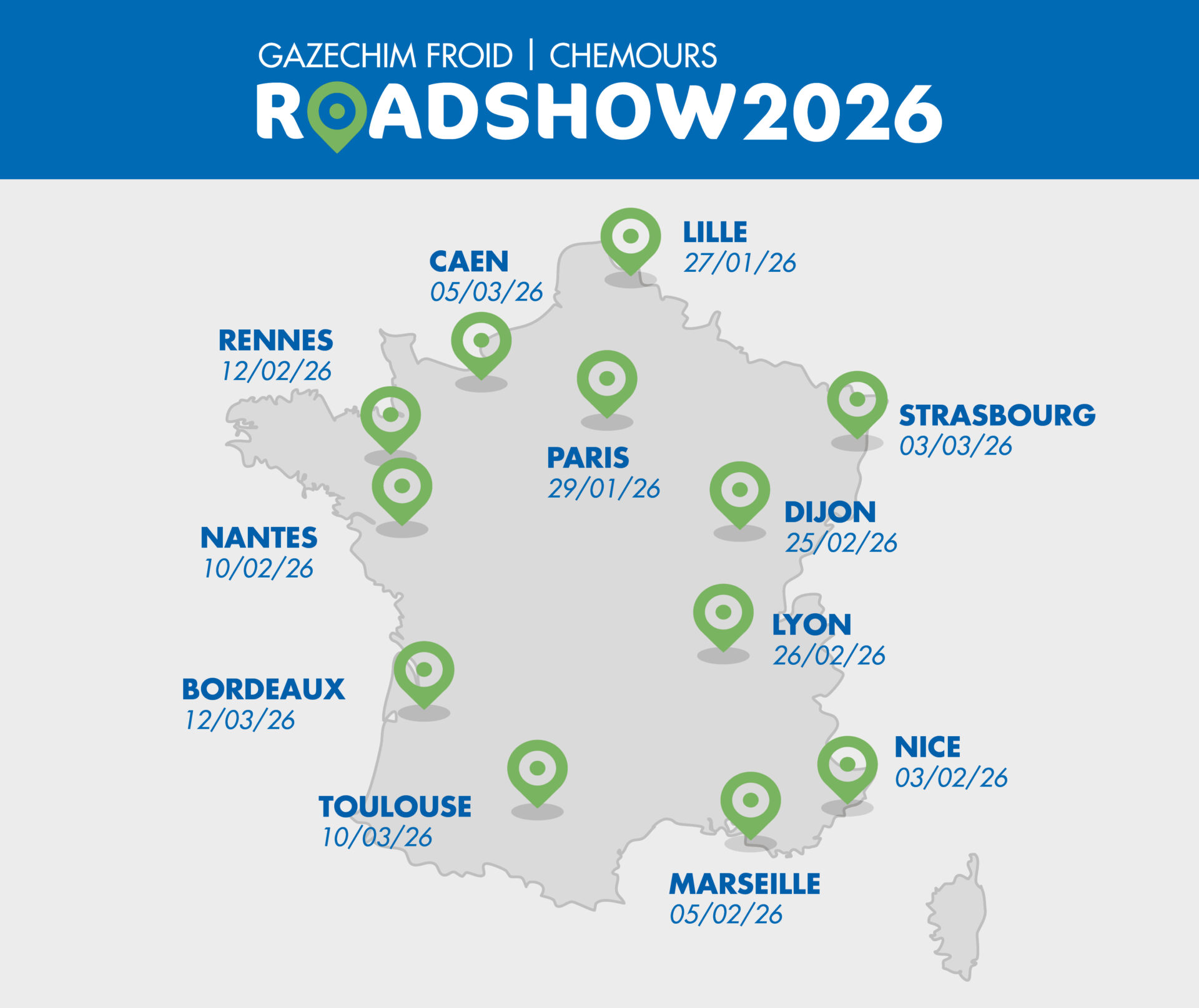Gazechim Froid organise, comme il y a deux ans, son tour de France des réunions d’information dans 12 villes différentes. L’occasion pour l’équipe commerciale et notre partenaire historique Chemours d’aller à la rencontre de leurs clients.